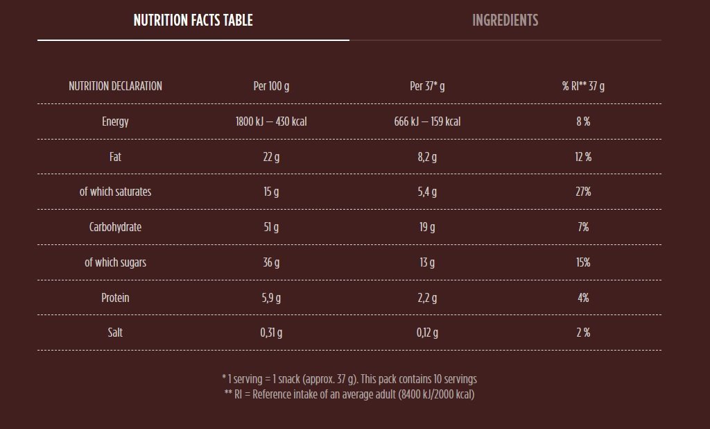 Sugar, vegetable fats (palm, palm kernel, coconut in varying proportions), glucose-fructose syrup, EGGS, WHEAT flour, reconstituted skimmed MILK (9.5%), MILK powder (5%), HAZELNUT paste (2.7%), skimmed MILK powder (1.9%), fat-reduced cocoa powder (1.8%), MILK proteins, salt, emulsifiers: mono- and diglycerides of fatty acids, SOYA lecithin’s; raising agents: ammonium carbonates, sodium carbonates, diphosphates; flavorings. May contain traces of other NUTS.